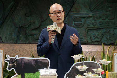 源興居生技股份有限公司總經理鍾迪名表示,源興牛又稱「台灣和牛」,因為有日本和牛「但馬牛」的基因,基因較純正,具備農耕牛的優點,血糖值較高,吃起來鮮甜。